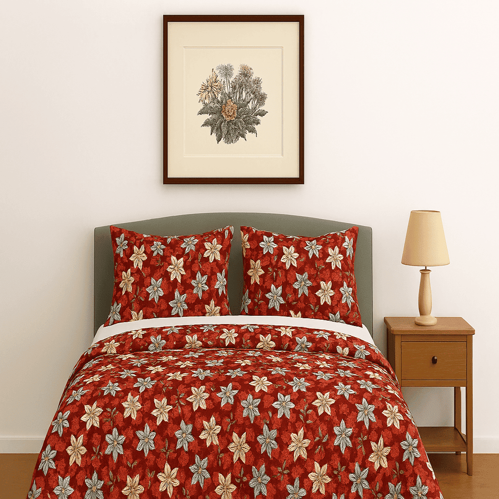 Transform your bedroom into a botanical haven with this vibrant 100% cotton bedsheet set. Featuring a striking red base adorned with blooming floral motifs in soft beige and blue, this design blends traditional charm with modern elegance. Crafted for comfort and durability, the breathable cotton fabric ensures a restful sleep while the vivid print adds a touch of artistry to your space.