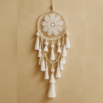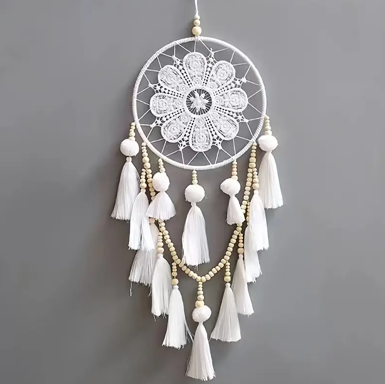 Infuse your space with the free-spirited charm of Bohemian design. This handcrafted dream catcher blends intricate lacework, soft feathers, and natural textures to create a serene focal point for any room. Whether hung in a bedroom, living area, or studio, it evokes harmony, protection, and artistic elegance.