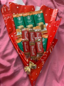 Indulge in the warmth of the season with our handcrafted Starbucks & Biscoff Snack Bouquet – a delightful fusion of premium coffee and iconic biscuits, wrapped in festive elegance. This gourmet arrangement features: