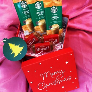 Celebrate the season with a cozy indulgence! This beautifully curated Christmas gift box features a trio of Starbucks Caramel Latte Premium Instant sachets paired with Lotus Biscoff cookies, all nestled in festive white shredded paper. The vibrant red box, adorned with white stars and a graceful “Merry Christmas” script, evokes holiday cheer and warmth. A charming green ornament tag with a yellow Christmas tree adds a delightful finishing touch perfect for gifting to coffee lovers, colleagues, or anyone who deserves a sweet seasonal treat.